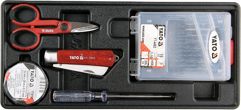 Vložka do zásuvky - izol. páska, zkoušečka, nůžky, montážní nůž, sada vrtáků 1-10mm